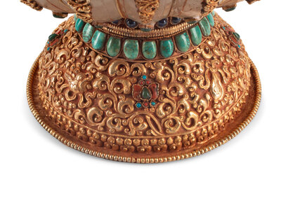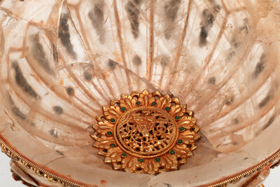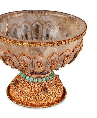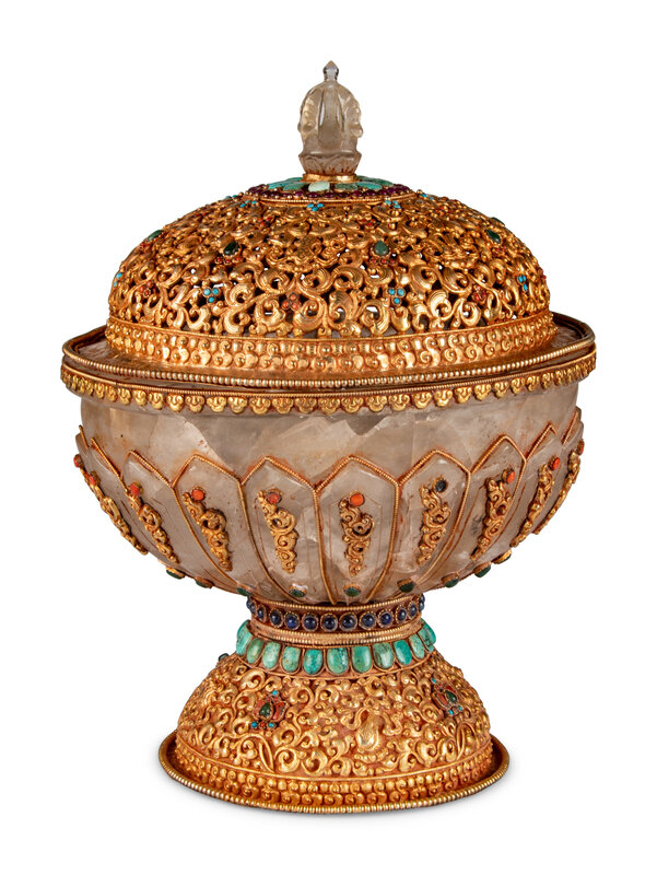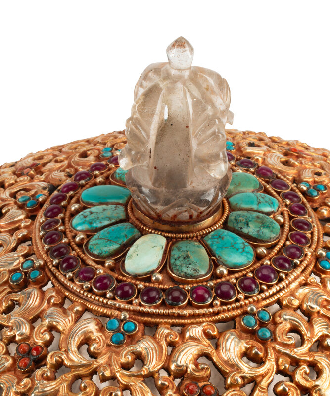 A Large Tibetan Style Jeweled Filigree-Mounted Rock Crystal Bowl and Cover