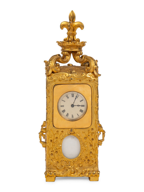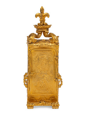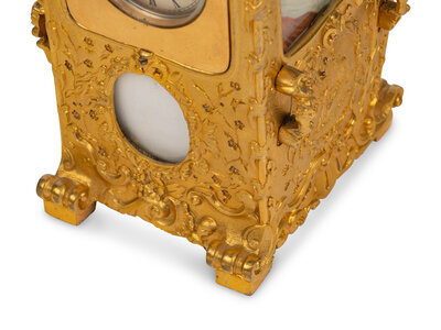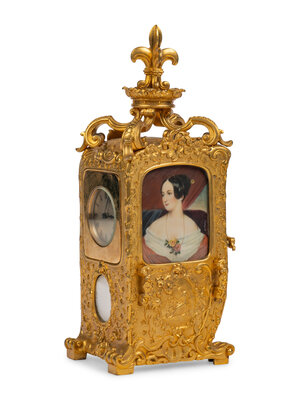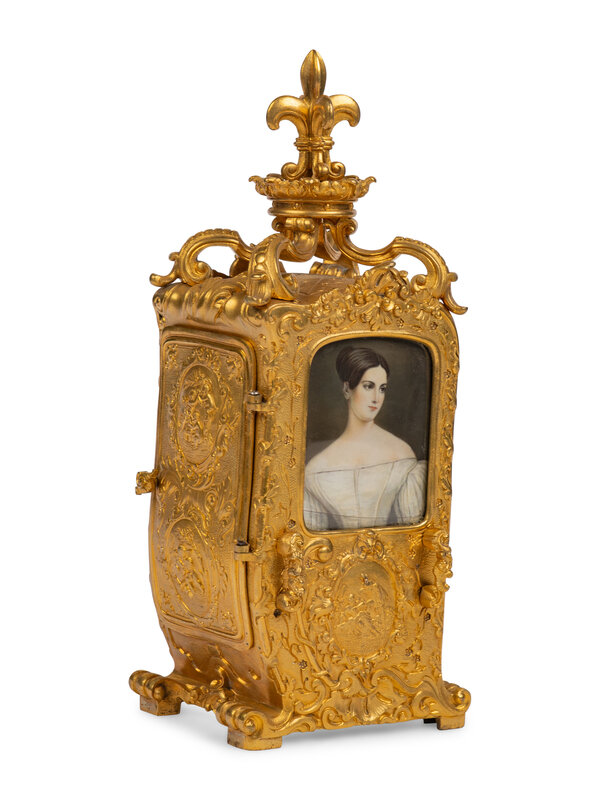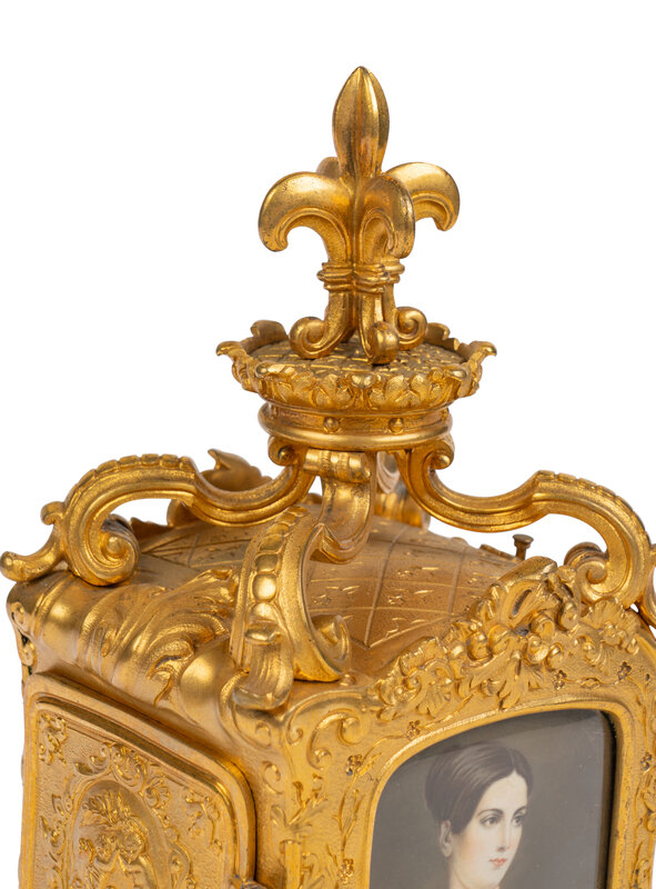 With fleur-de-lys crest and relief filigree decoration, the front with a portrait of cupid, the side panels with portraits of women; the inset silvered brass dial with