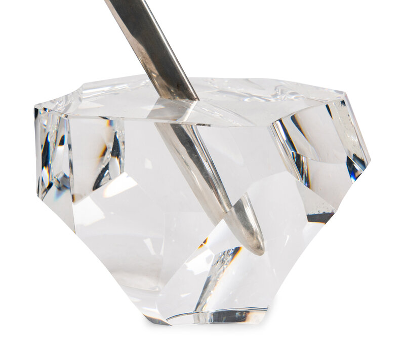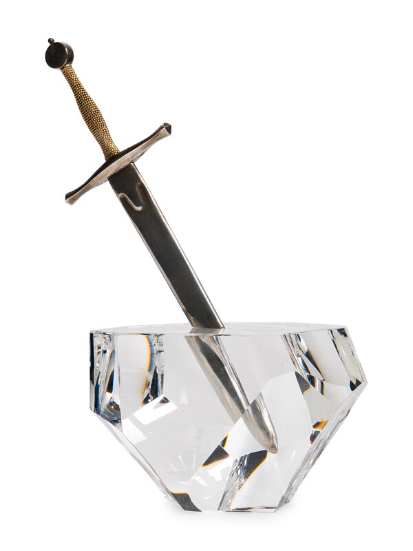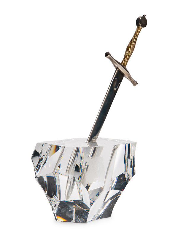 A Steuben Glass, Sterling Silver and 18 Karat Gold Excalibur Sculpture
