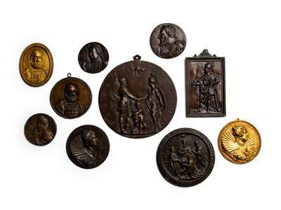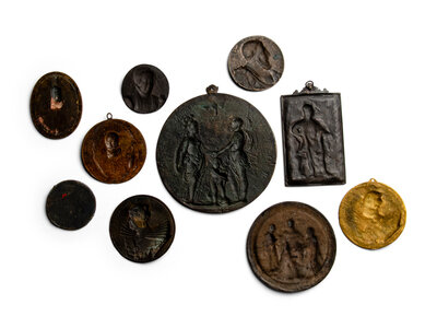 Ten Continental Bronze and Gilt-Bronze Commemorative Bas Relief Plaques