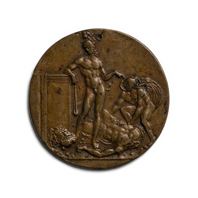 depicting David standing over a decapitated Golaith (drilled and scratched 'M' on surface, 72.8 g, 65mm).