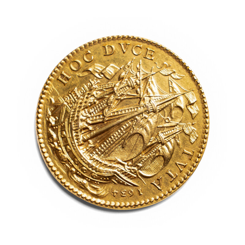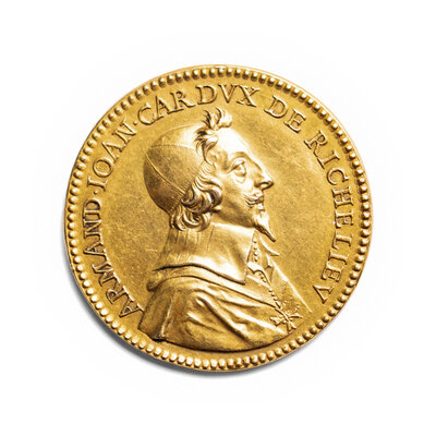 the obverse decorated with a portrait bust of the cardinal surrounded by the inscription ARMAND IOAN CAR DUX DE RICHELIEU the reverse with a warship at sail surrounded by the inscription HOC DVCE TVTA-1634 (19.6 g, 33mm)