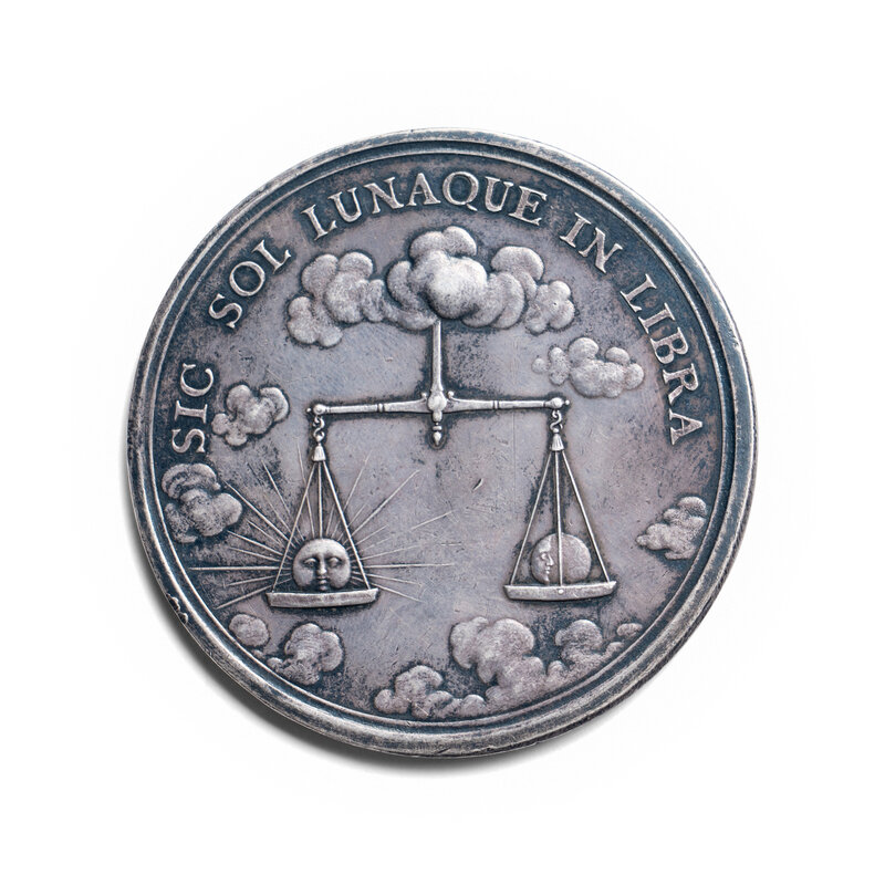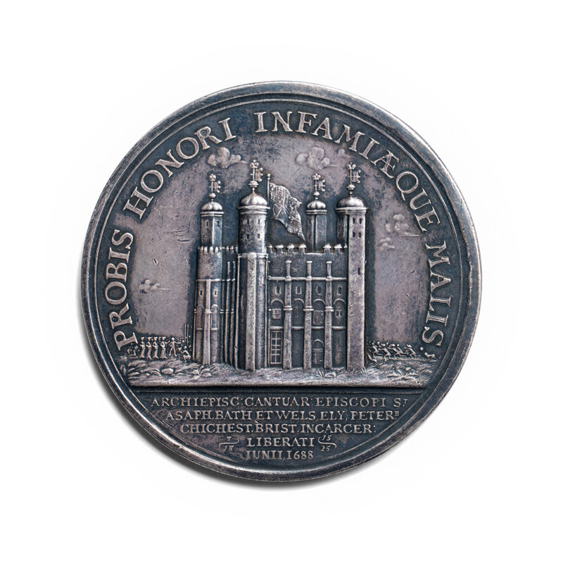the obverse centered by a scene of the Tower of London surrounded by the motto 'Probis Honori Infamiaeque Malis" and surmounting an inscription of the archbishops who were imprisoned and the dates of their imprisonment and liberation, the reverse with the sun and moon in balance on scales surrounded by the motto 'Sic Sol Lunaque in Libra'.
