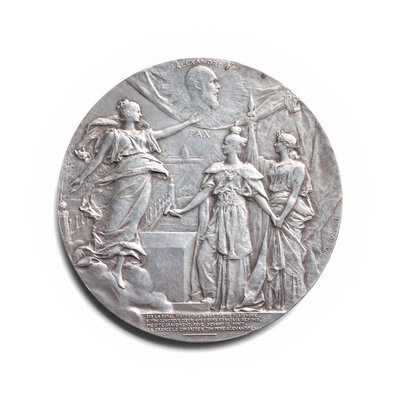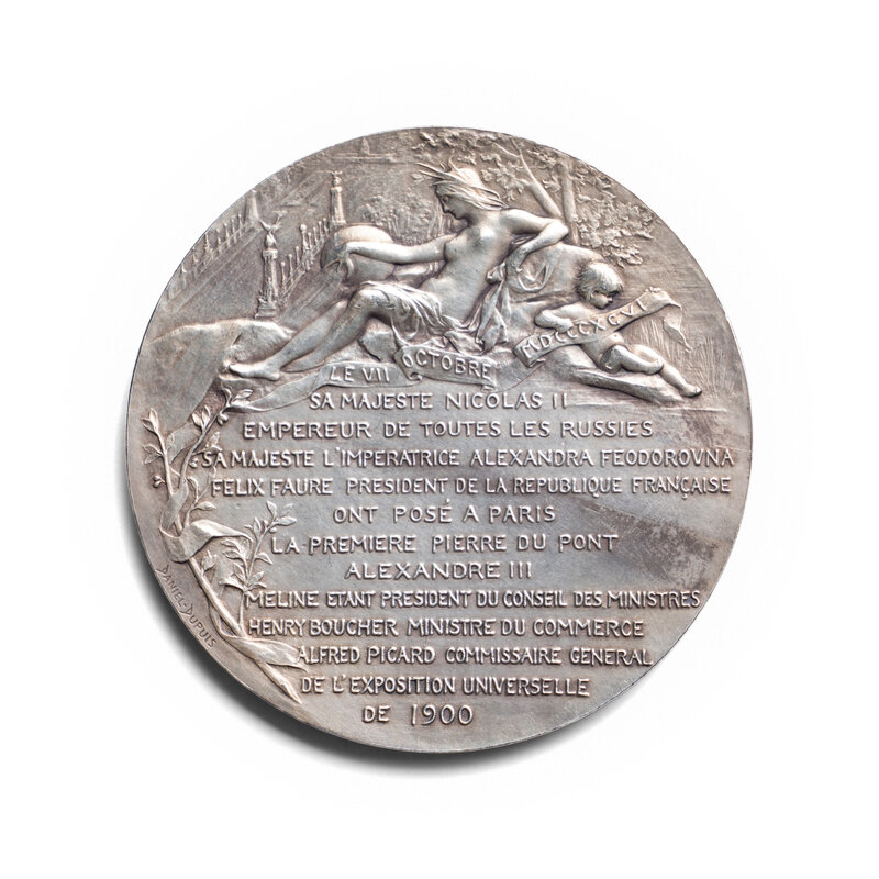 the medal commissioned for Czar Nicholas II and Czarina Alexandra Feodorovna's visit to Paris for the 1900 Exposition Universelle (140.5 g, 70mm).
