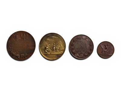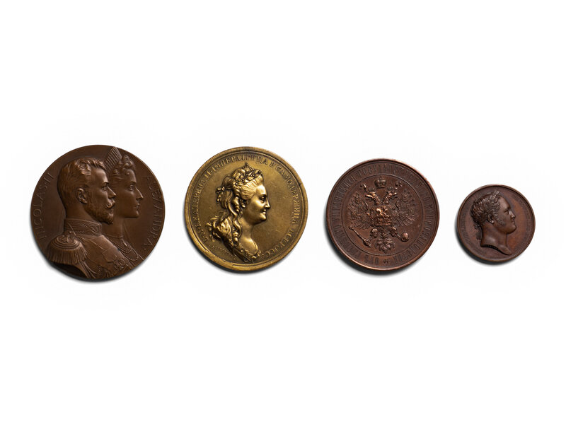 1) A gilt-metal example by C. Leberecht with a portrait bust of Catherine II on obverse, the reverse with a commemorative scene dated May 21, 1779 (cyrillic) (100 g, 65mm).