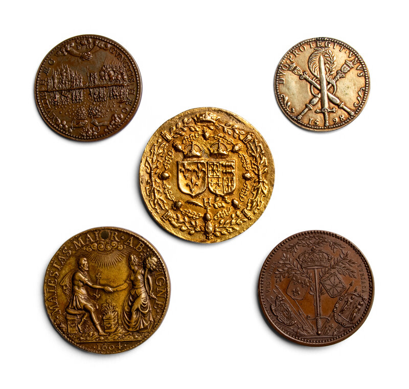5) A silvered-metal example with a portrait bust of Henry IV on obverse, the reverse with a sword and crossing scepters with the motto