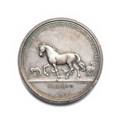 by A. Lavy, the obverse with a portrait bust of Victor Emmanuel, the reverse with a scene of Horses crazing in a field with the inscription Prosperita Delle Razze Indigene Cavalli/Premio (64.5g, 53mm).