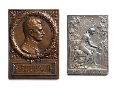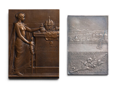 1) A French silvered-bronze example by Ch. Baylard and F. Vernon commemorating the opening of the Baths at Evian (67.4 g, 65 x 44mm).