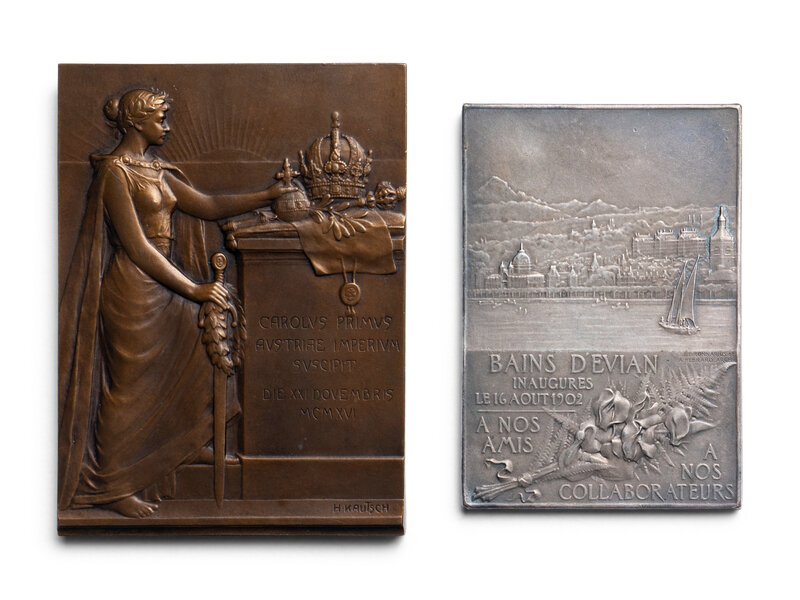 2) An Austrian bronze example by H. Krautsch commemorating the coronation of Emperor Charles I on November 21, 1916 (150.9 g, 75 x 55mm).