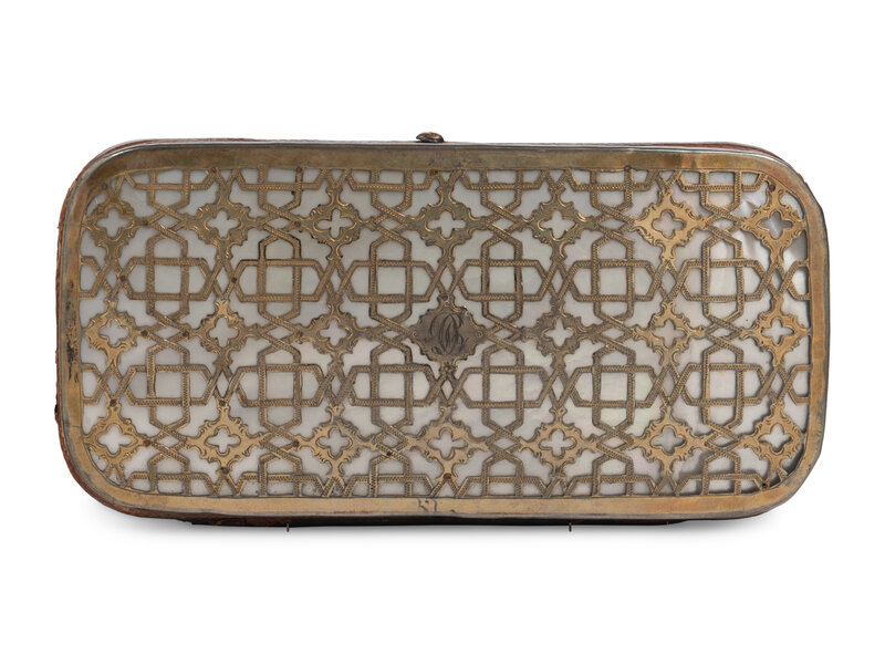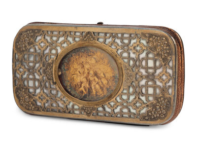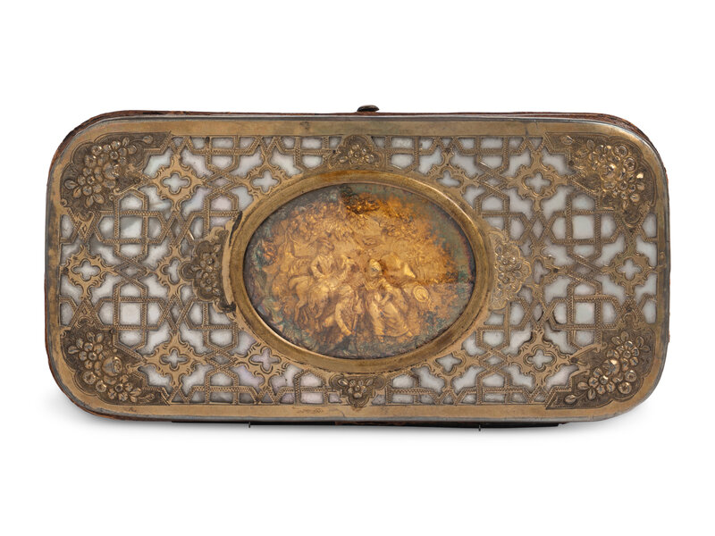 the sides with silver-gilt open work decoration over a mother-of-pearl base, one side centered with a repoussé figural group in gold.