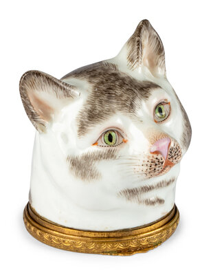 in the form of a cat's head with blue crossed-swords mark on back of neck.