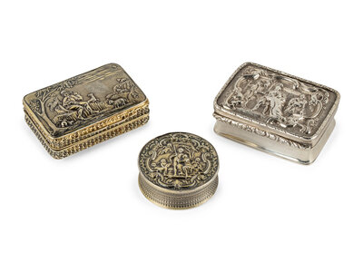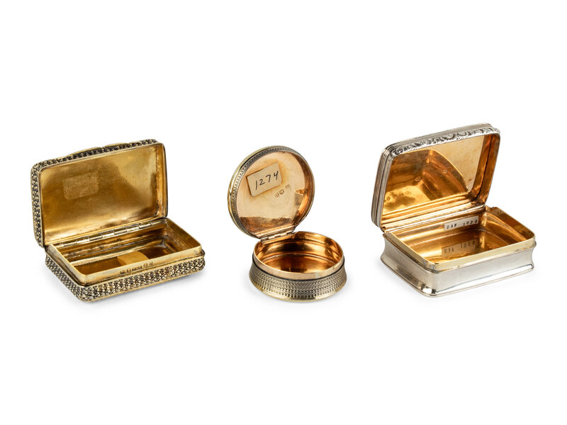 comprising a regtangular Scottish example decorated with a repousse Classical figural scene on the lid, the underside with an engraved crest and monogram, the box marked for Robert Haxton, Edinburgh, 1820, a rectangular silver-gilt example with the lid decorated with a scene of a shepherd attending his flock and marked for Thropp and Taylor, Bigmingham, 1812 and a circular parcel-gilt example with the lid decorated with a repousse figural scene and marked for Daniel Hockley and Thomas Bosworth, London, 1815.