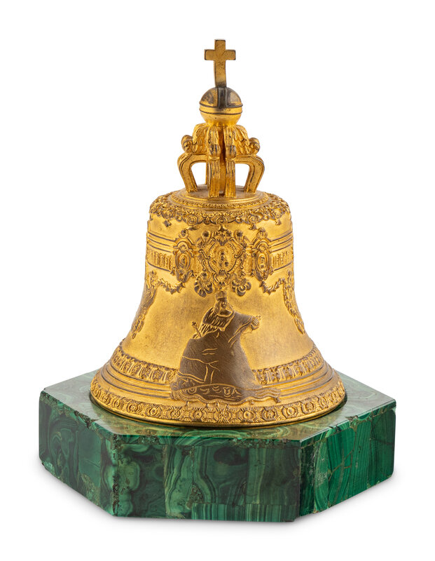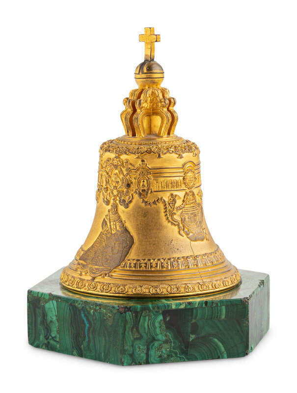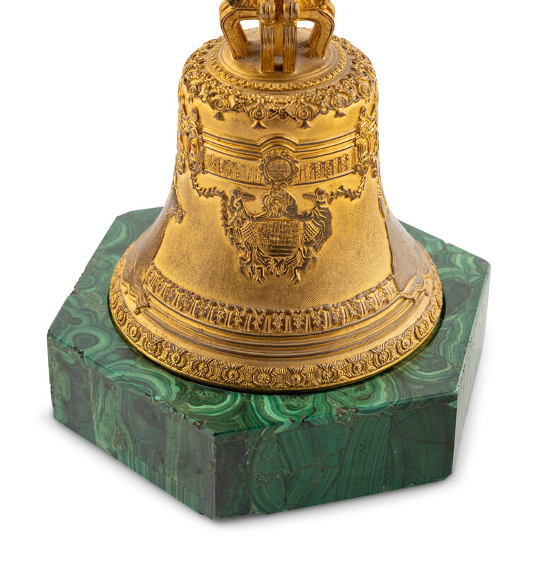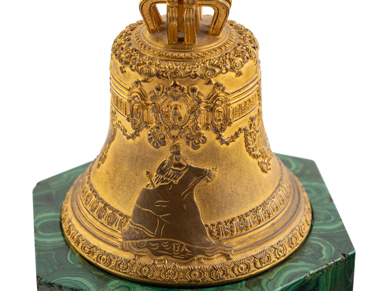 the mouth with an engraved cyrillic inscription describing the dimensions and casting date of the original bell and set on a malachite base.