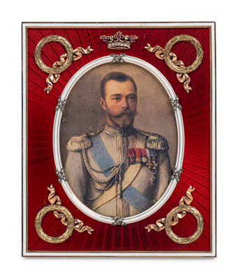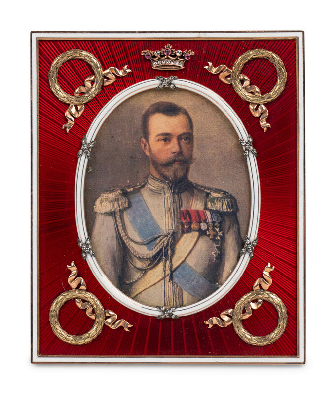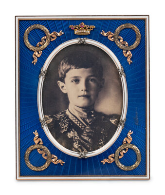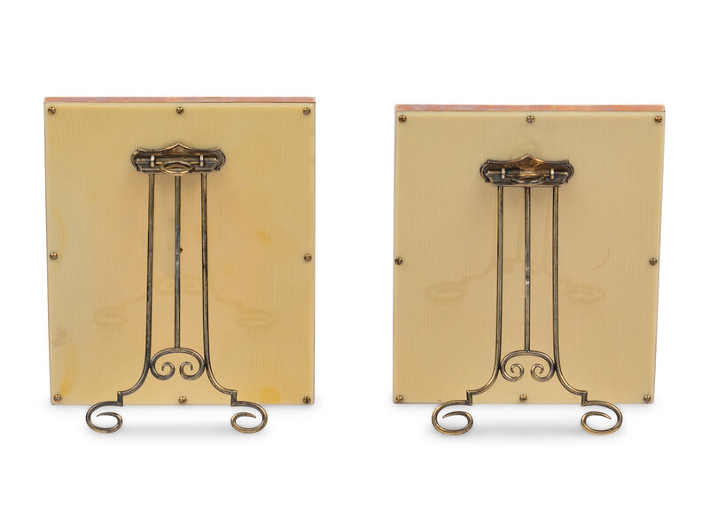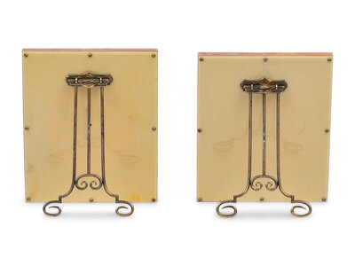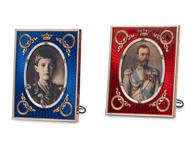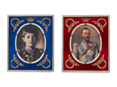A Pair of Guilloché Enamel, 14k Vari-Color Gold, Diamond, and Cabochon-Mounted Picture Frames