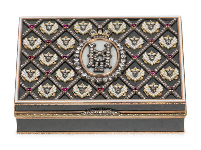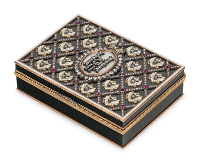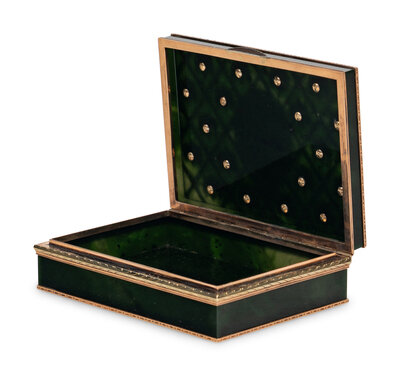 A 14 Karat Gold, Diamond and Guilloché Enamel Inset Hardstone Snuff Box