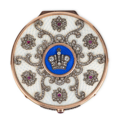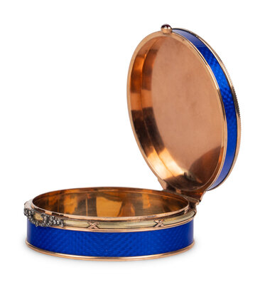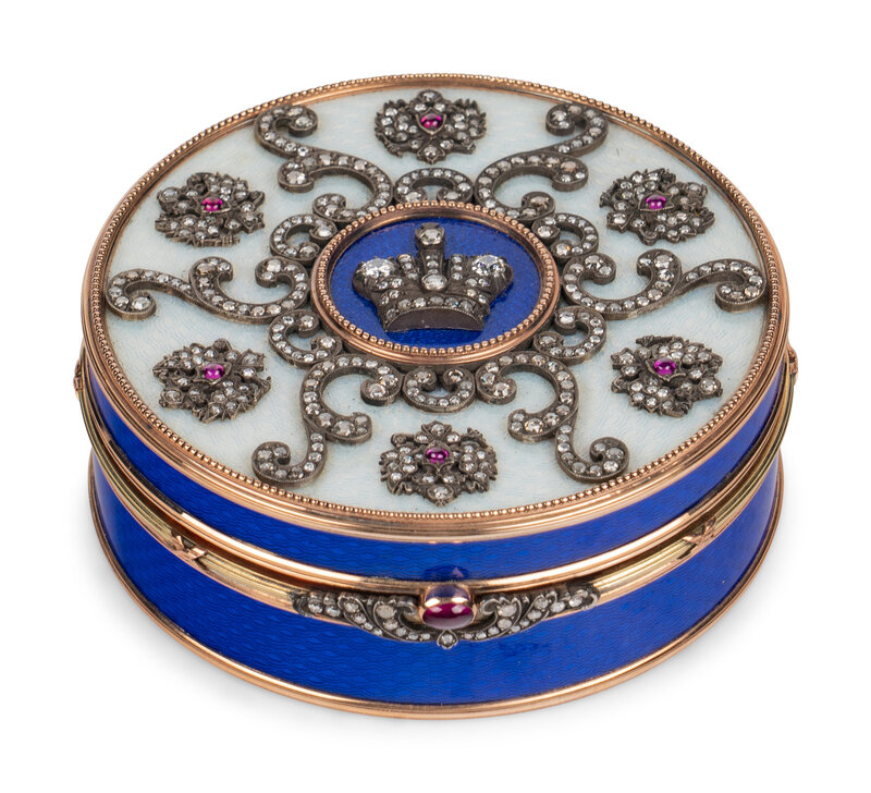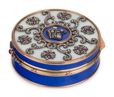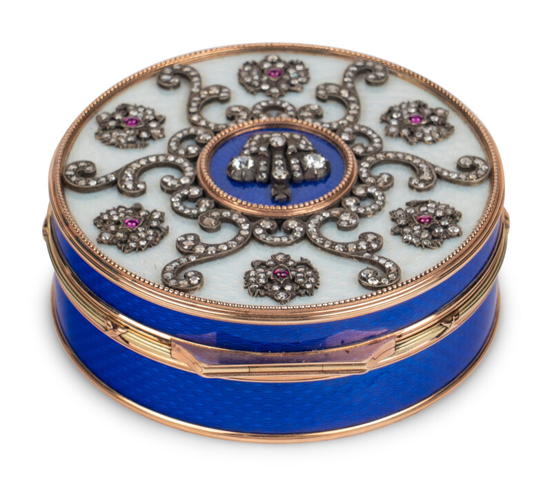 A 14 Karat Vari-Color Gold, Guilloché Enamel, Diamond, and Cabochon Jewel-Mounted Snuff Box