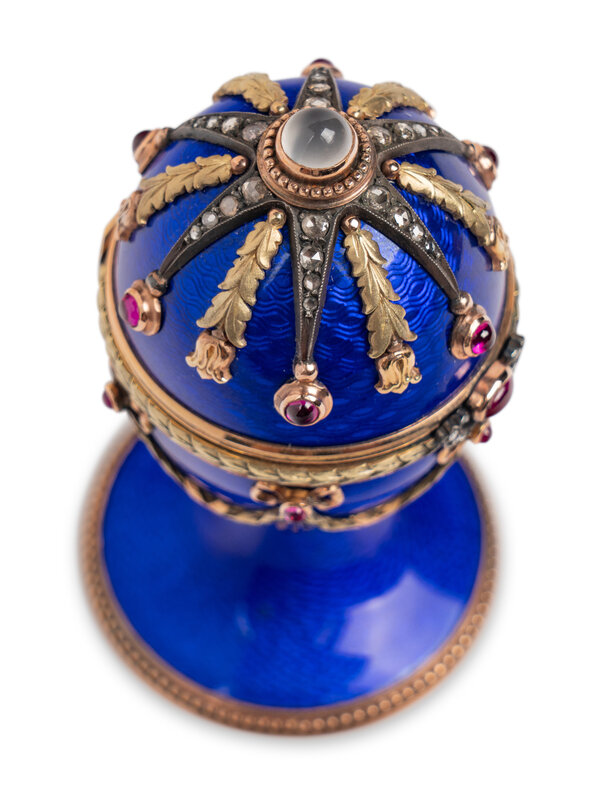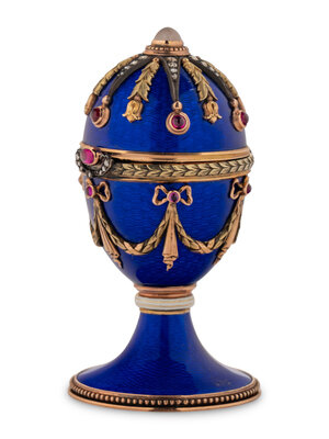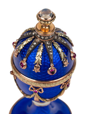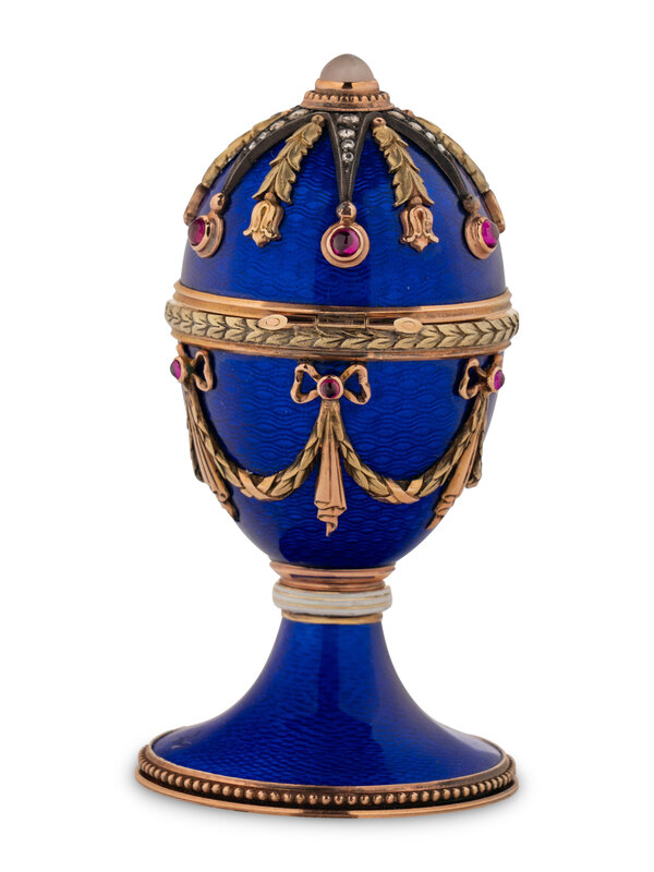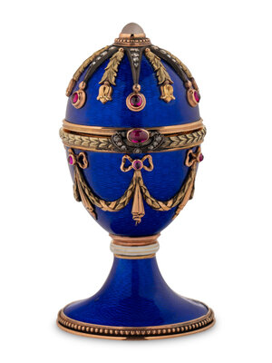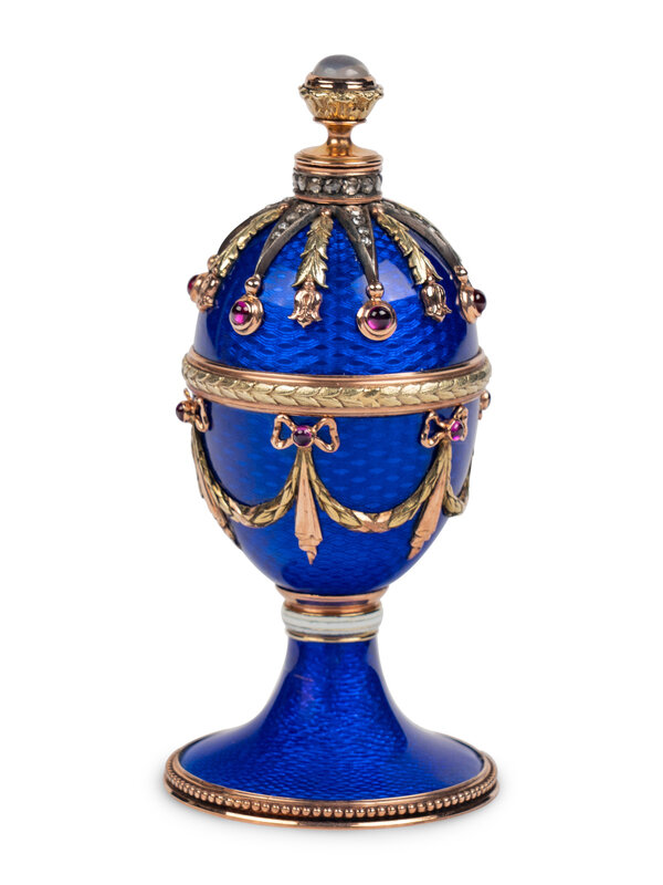 A 14 Karat Vari-Color Gold, Guilloché Enamel, Diamond, and Cabochon Jewel-Mounted Egg-Form Perfume and a Related Guilloché Enamel, 14 Karat Vari-Color Gold, Diamond, and Cabochon-Mounted Surprise Egg