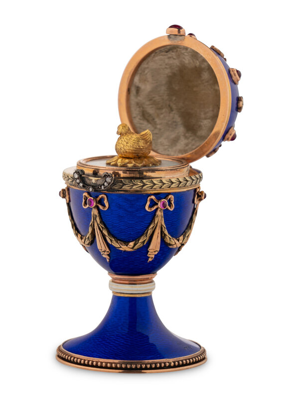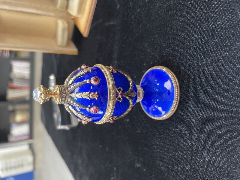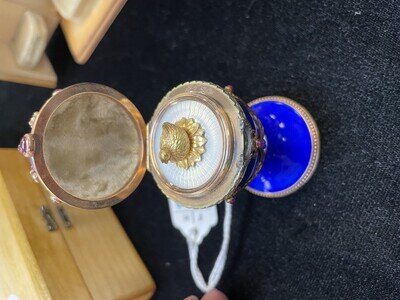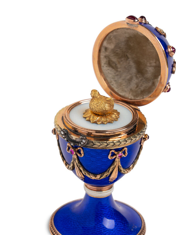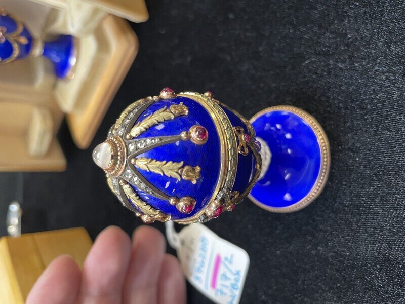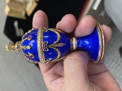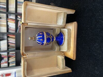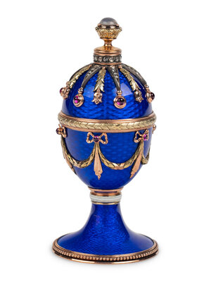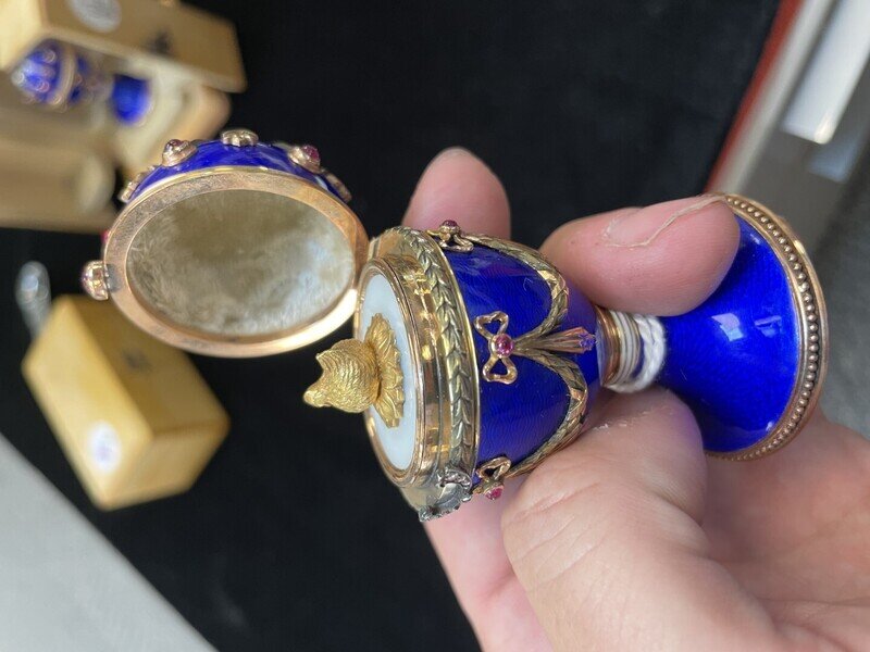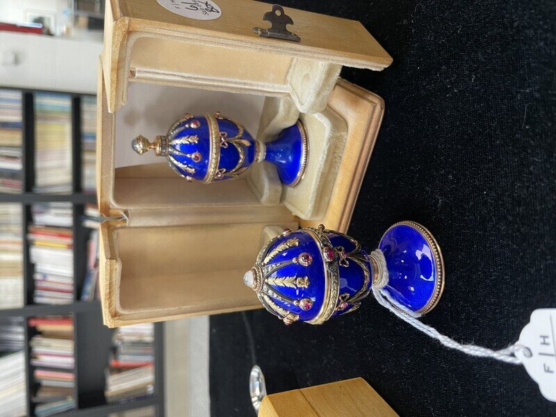 The perfume and egg on stand with a surprise chicken housed in fitted boxes.