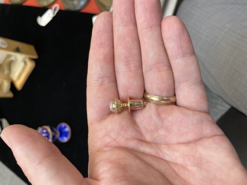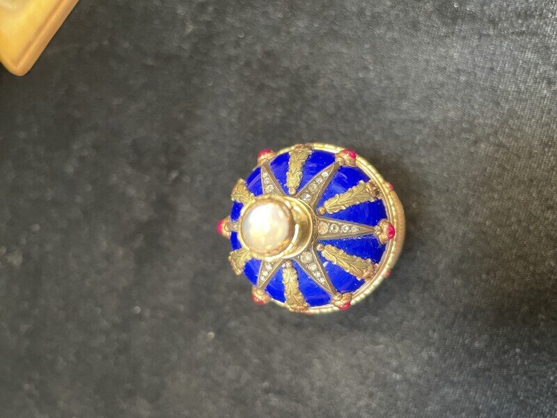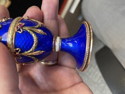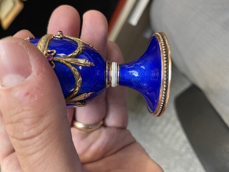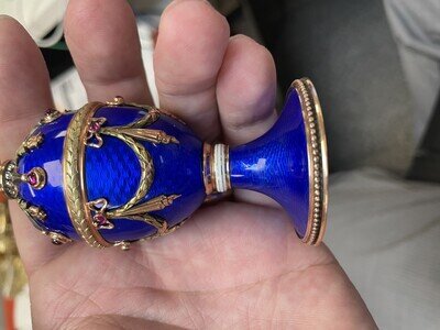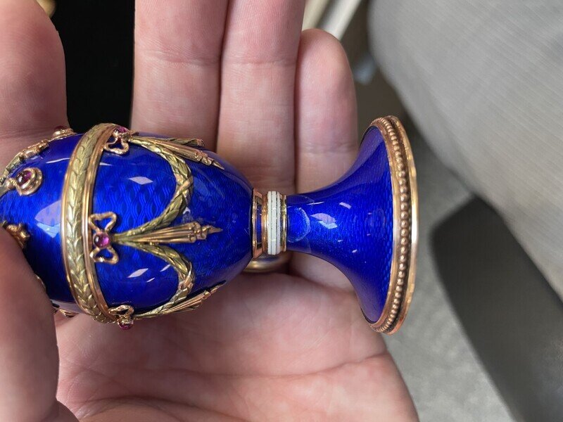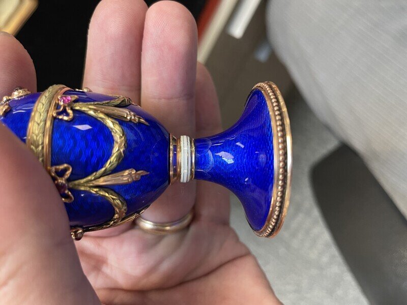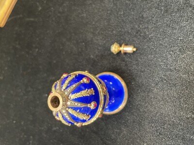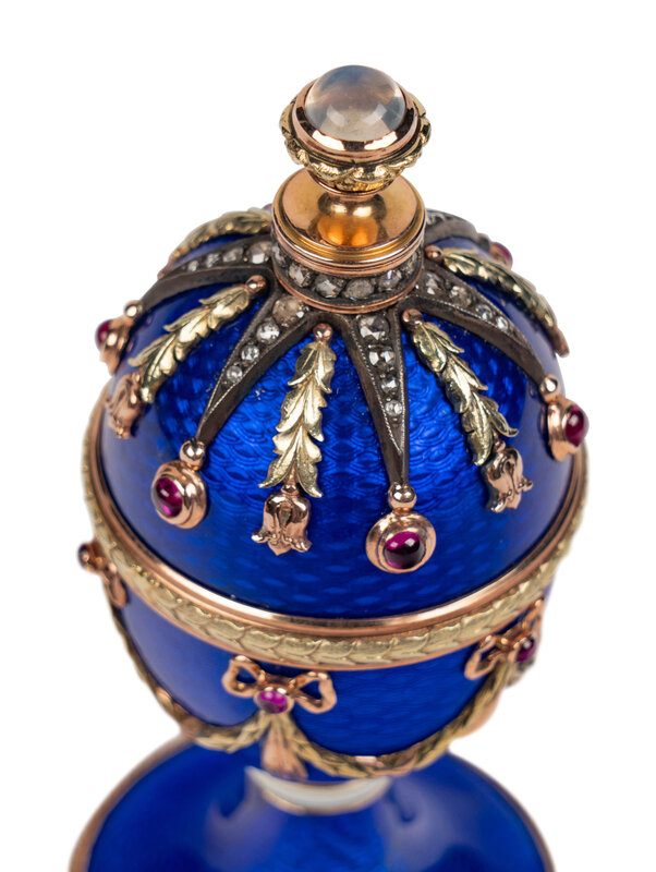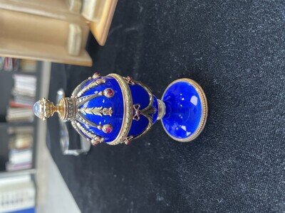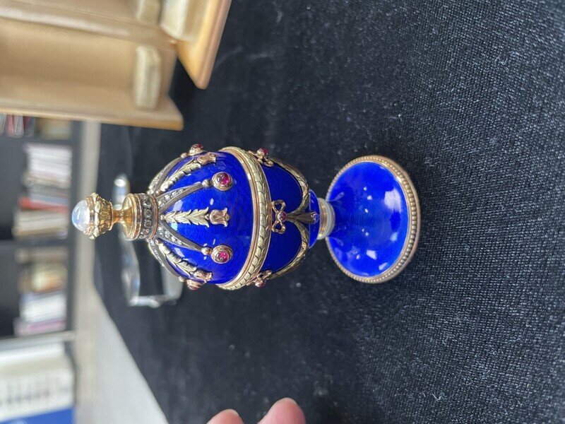The perfume and egg on stand with a surprise chicken housed in fitted boxes.