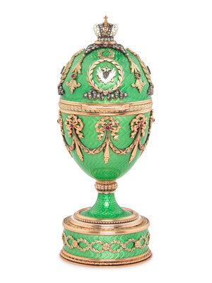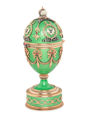 A Gold, Guilloché Enamel and Gemstone-Mounted Surprise Egg