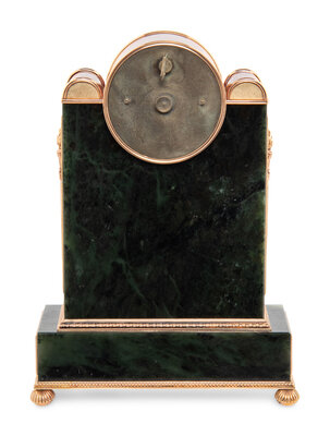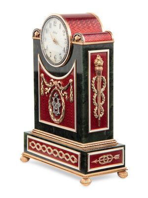 A Gold, Guilloché Enamel, Diamond, Gemstone and Nephrite Mantel Clock