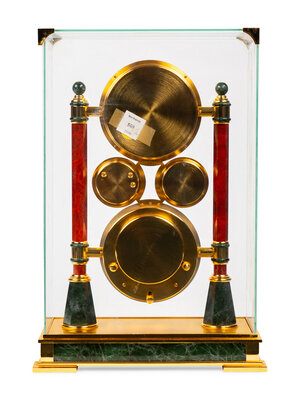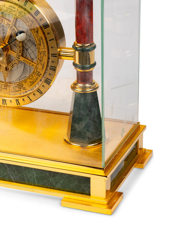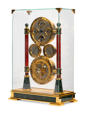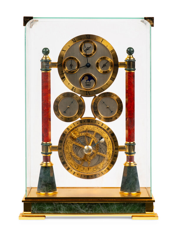 With subsidiary calendar, barometer and thermometer dials and a glass case.