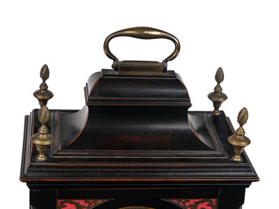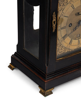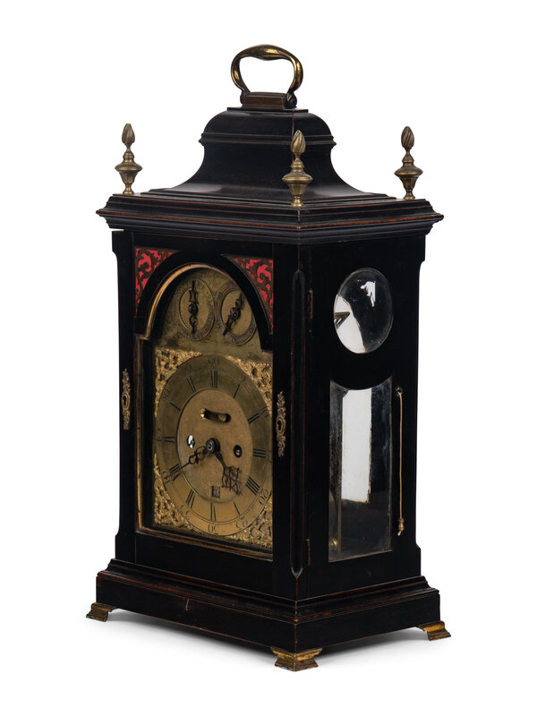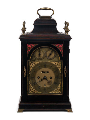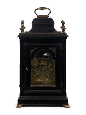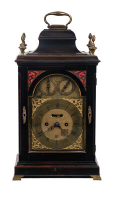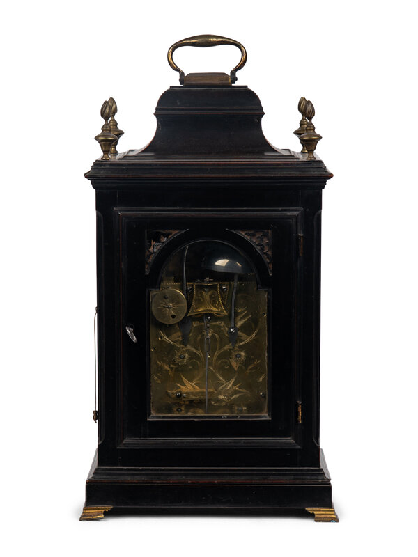 the works with a chiming repeat-mechanism and a musical pin-barrel with six hammers striking six bells, the works with an engraved back-plate.