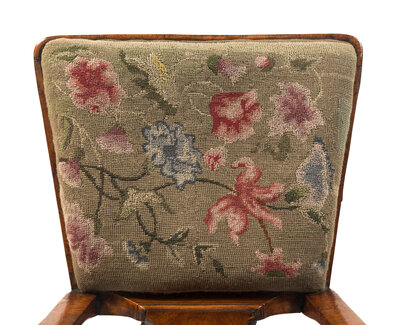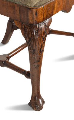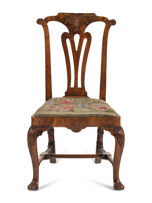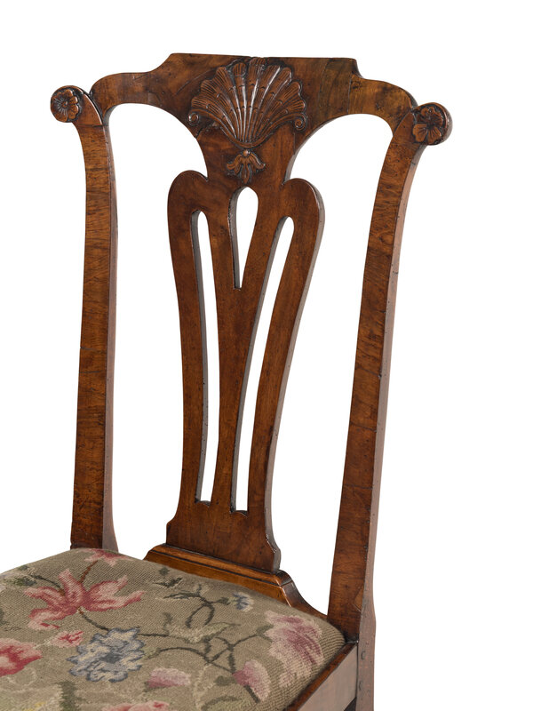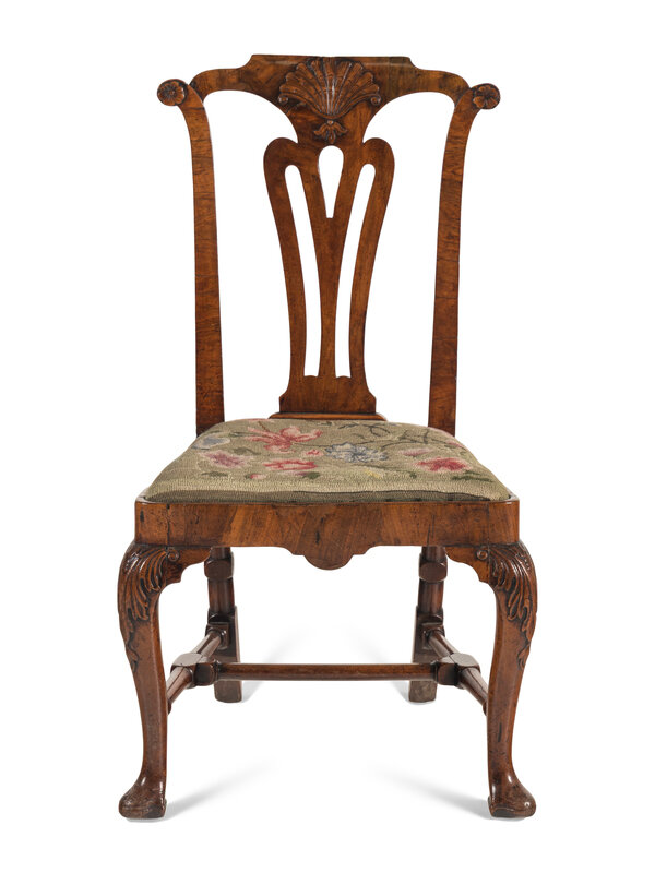 the crest rail with a large carved scallop shell surmounting an open-work vasiform splat and raised on cabriole forelegs ending in trefid feet and joined to back legs with a stretcher.