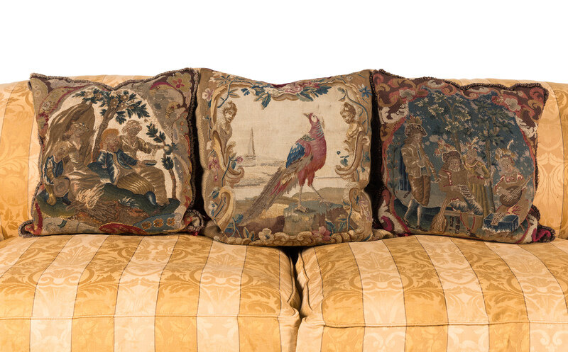 with three tapestry-upholstered pillows.