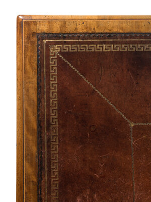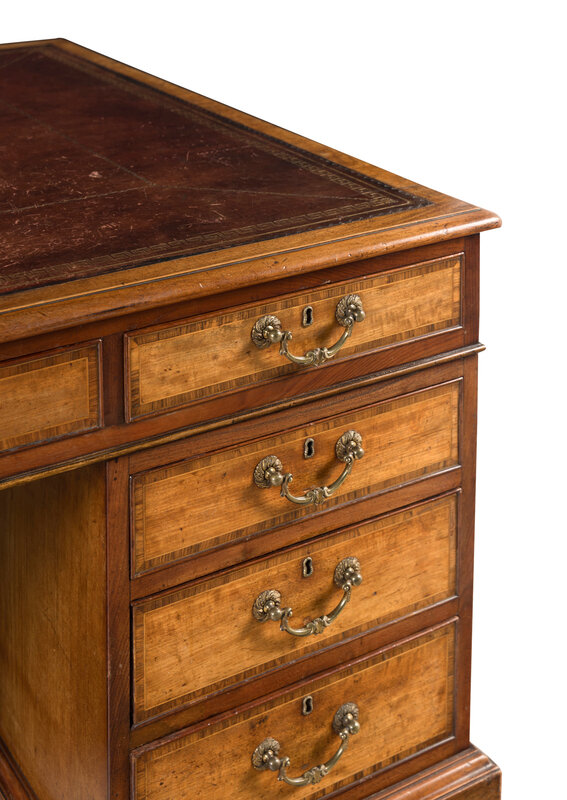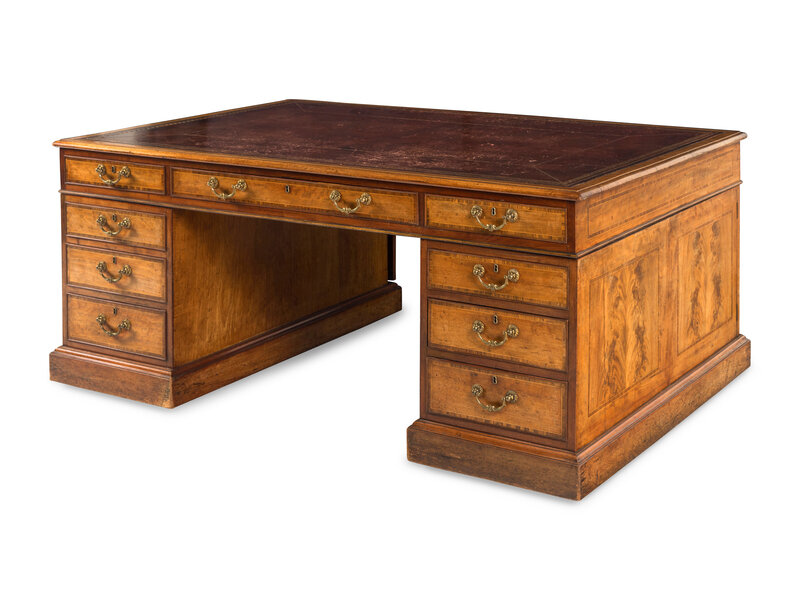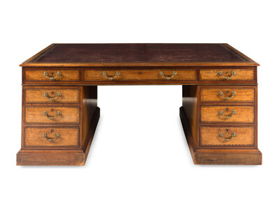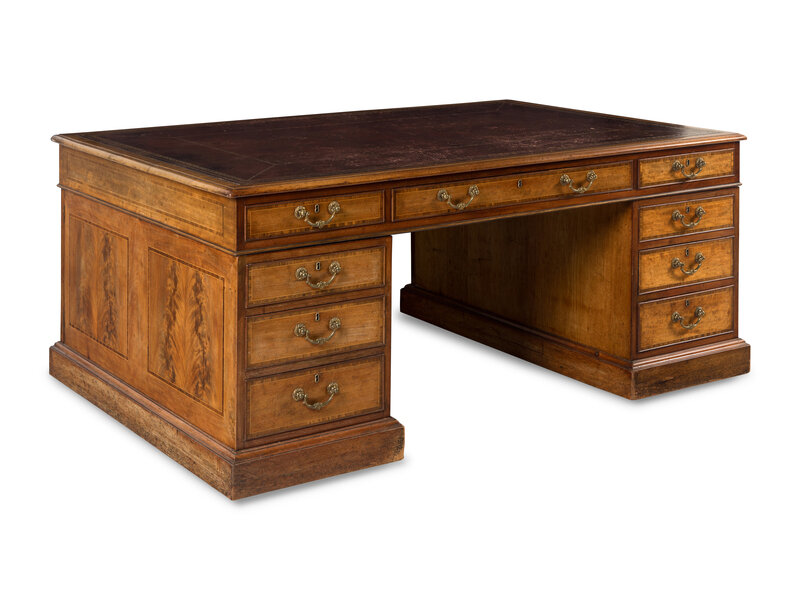 the inset writing surface surmounting three frieze drawers and three-short drawers on each plinth, the opposite side of plinth with doors opening to a shelved compartment on one side and a divided compartment on the opposing plinth.
