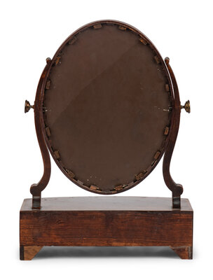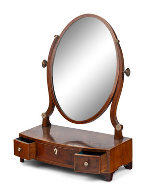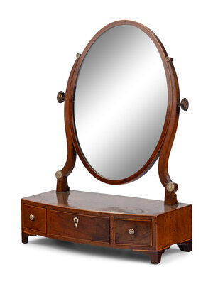 the oval mirror surmounting a long and two smaller flanking drawers and raised on bracket feet.