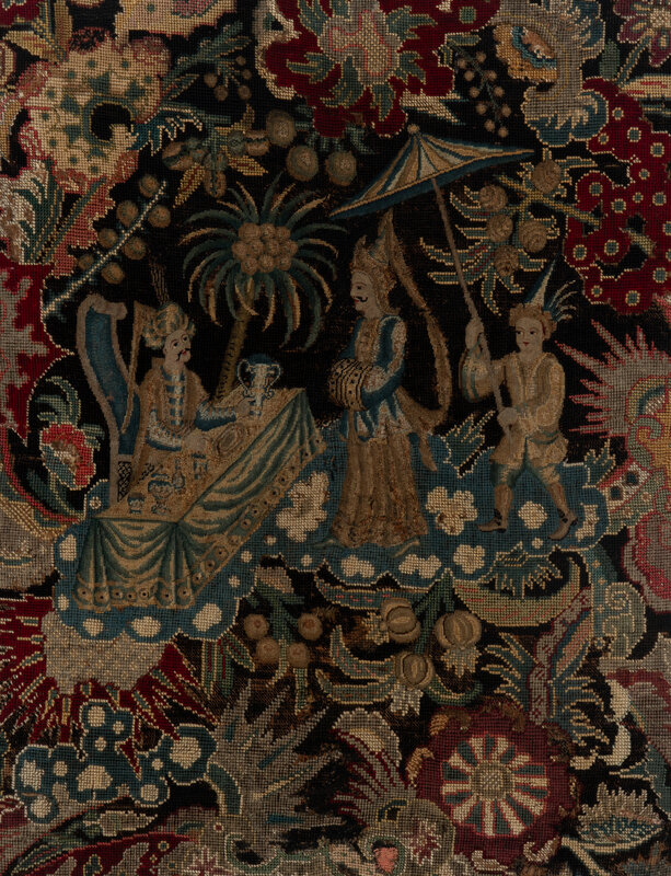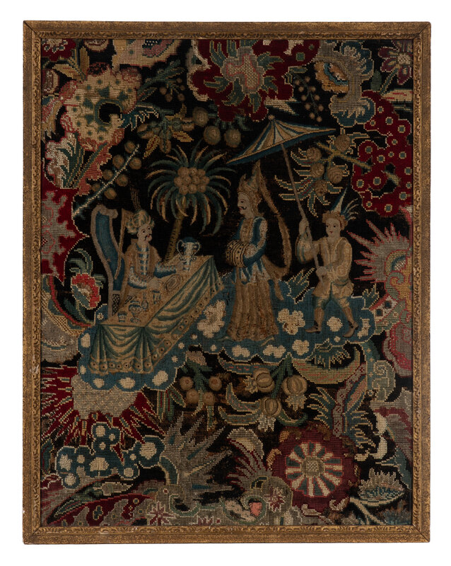 depicting a meeting of two orientalist figures in a garden with an attendant.