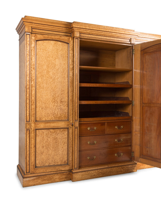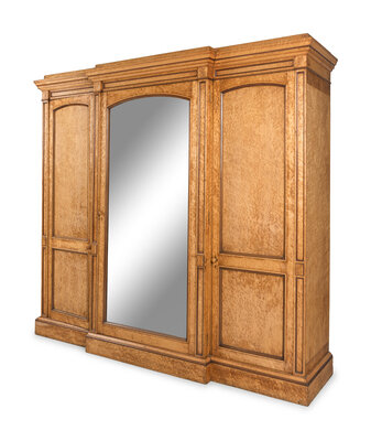 in three sections, the central mirrored door opening to a fitted interior with four linen shelves surmounting two short and two long drawers, the flaking cabinets opening to interiors fitted for hanging clothes.