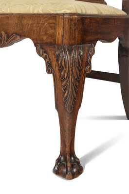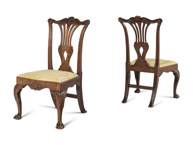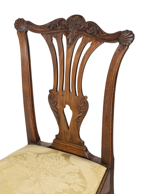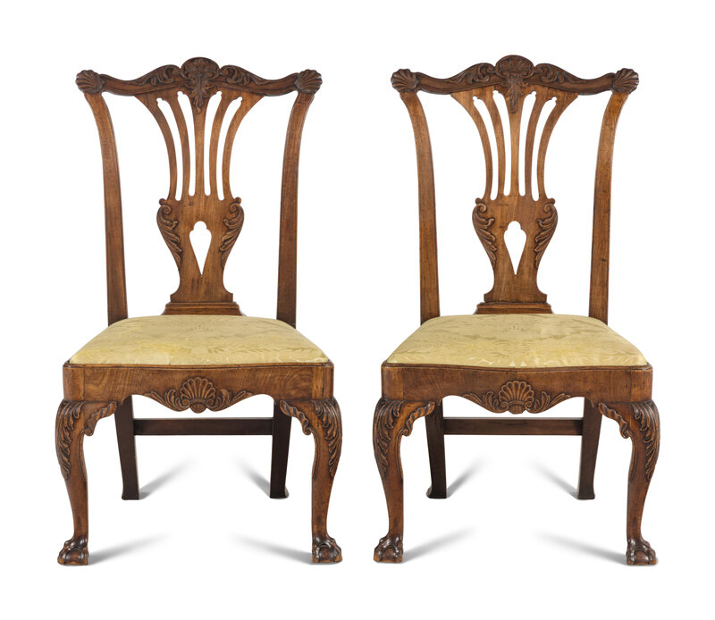 the crest rail with carved scallop shell ends above a pierced vasiform splat, the apron with carved shell and foliate decoration on front surmounting cabriole forelegs decorated with foliate knees and ending in claw and ball feet.
