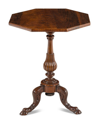 the top with grain-painted elements and raised on a fluted vasiform stem with cabriole legs ending in paw feet.