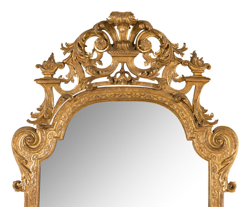 the beveled plate within a strapwork border with trellis and foliate motifs with foliate volutes at angles and surmounted with a possibly later cornice with acanthus and volute decoration flaked by flaming urns.