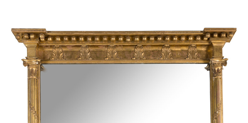 the rectangular mirror plate in two-parts with foliate-wrapped compound column decorated sides, the top with a frieze decorated with acanthus leaves at intervals and surmounted by a ball decorated cornice.