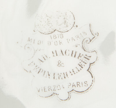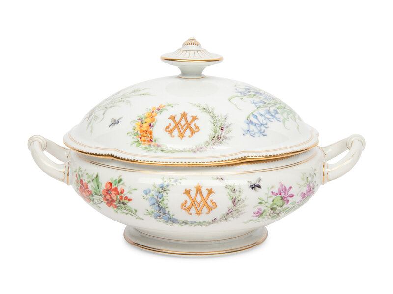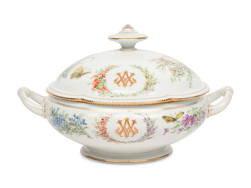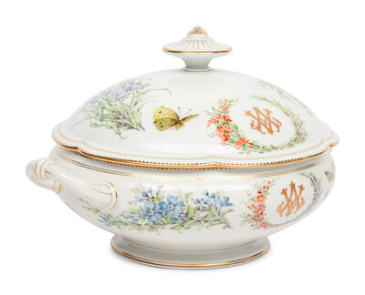 the lid and body with polychrome floral and butterfly motifs with a gilt monogram within a laurel cartouche and stamped with maker's mark on underside.