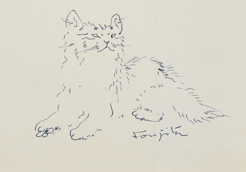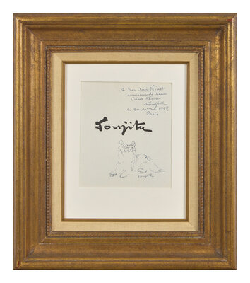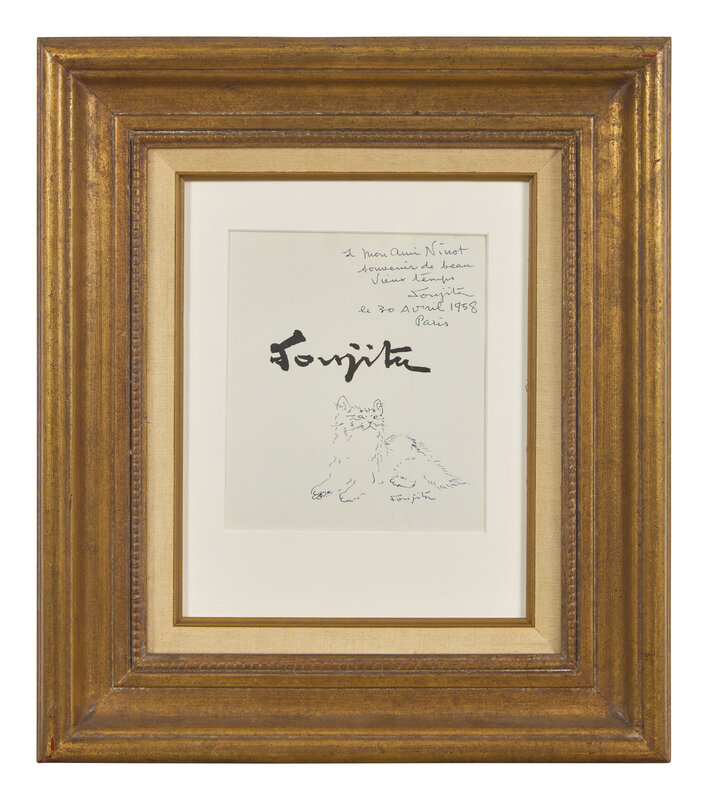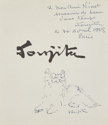 signed 'Foujita' (lower right); signed again, dedicated 'a mon ami Ninot/souvenir de beau/vieux temps,' dated and located 'Paris' (upper right)