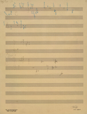 pencil and blue crayon on score sheet