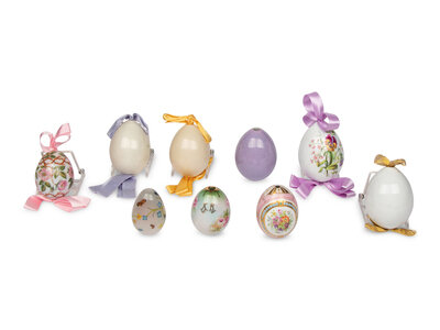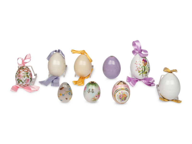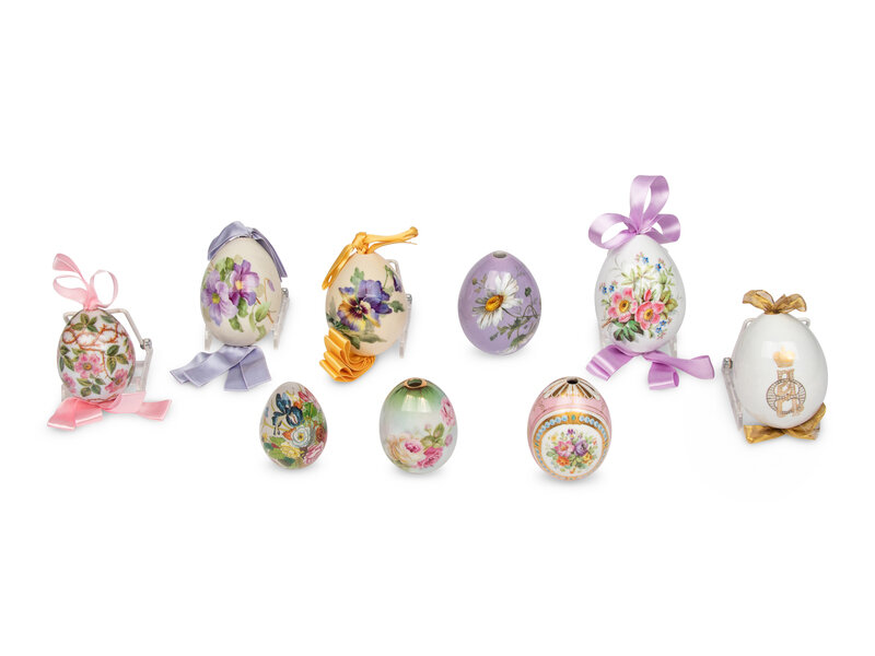 comprising an example decorated with the crowned cypher of Empress Alexandra Feodorovna, the other examples with floral spray decoration, together with a modern glass example; 9 items total.