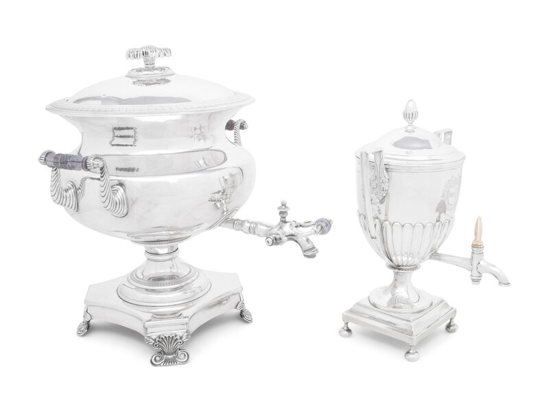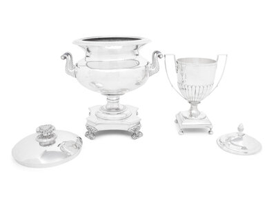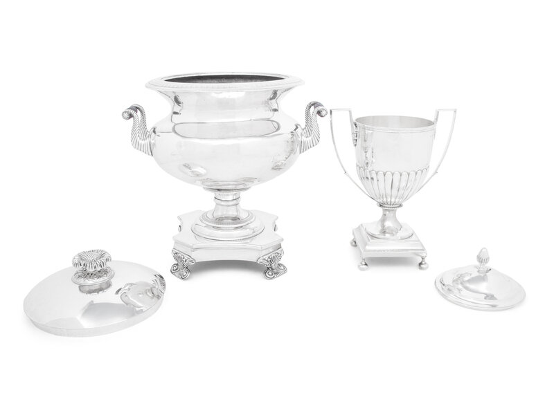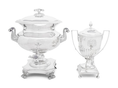 the twin-handled vasiform body surmounted with a domed lid with acorn finial, the body decorated with an engraved coat of arms of the Carmichael family, together with a larger silver-plate example; 2 items total.
