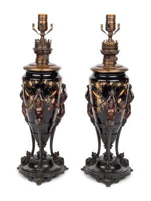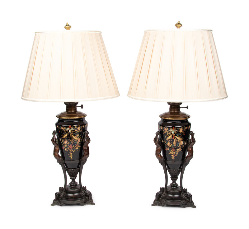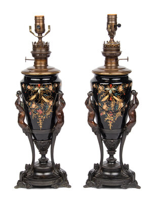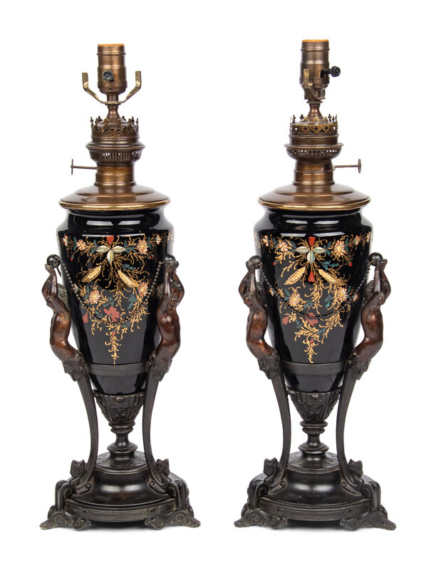A Pair of Victorian Painted Glass and Cast Metal Amphorae Mounted as Lamps