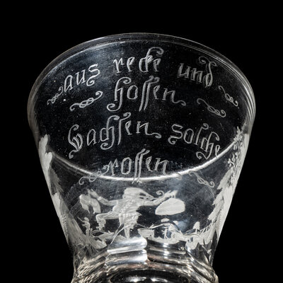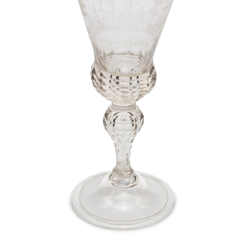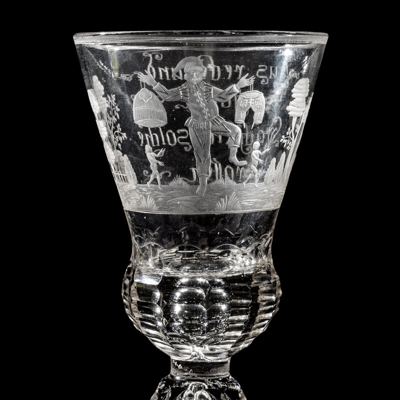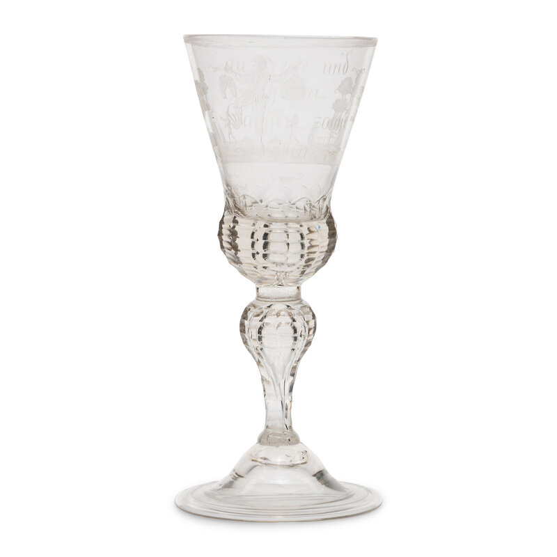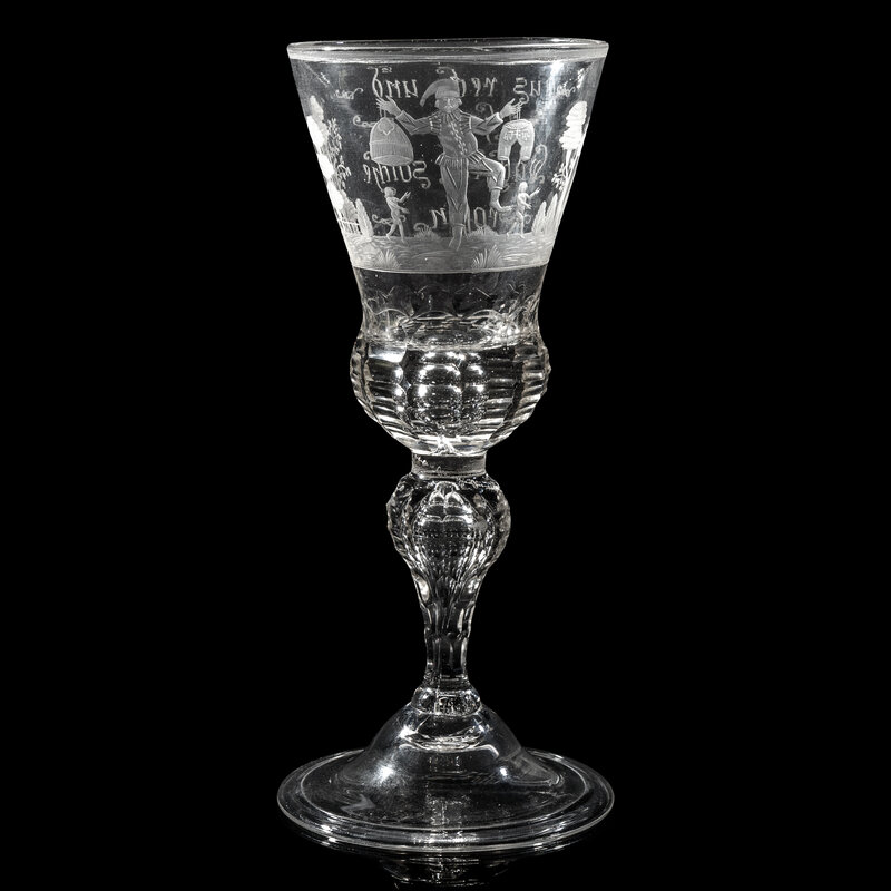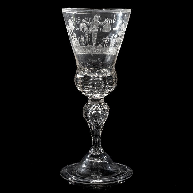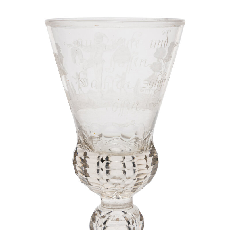 the bowl engraved with a Jester holding lederhosen and a skirt aloft flanked by two naked figures in the distance within a forest landscape, the opposite side of the bowl engraved 'Aus Recke und/ Hosen/ Wachsen solche/ Rosen', and surmounting a facet cut baluster stem and a domed foot.