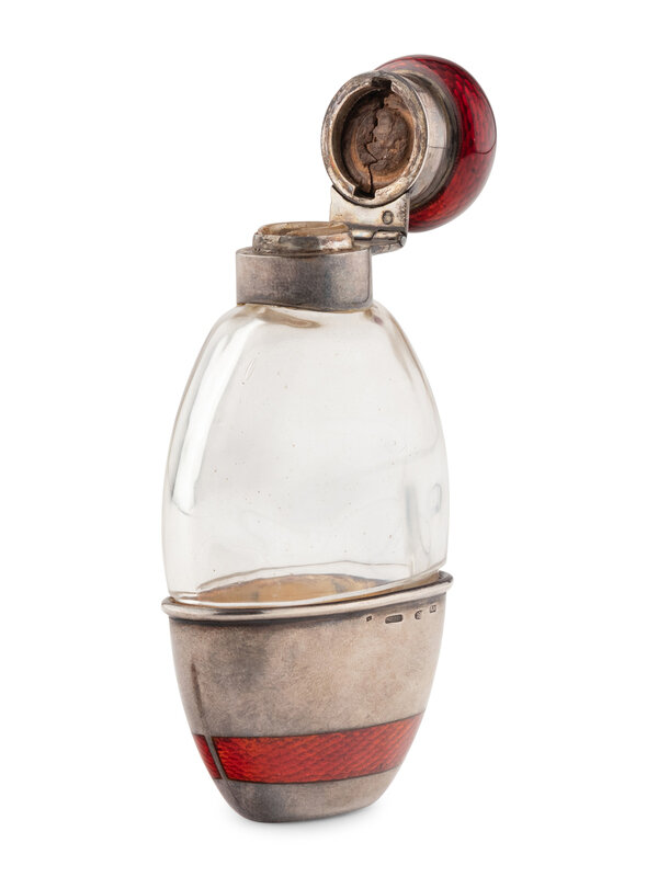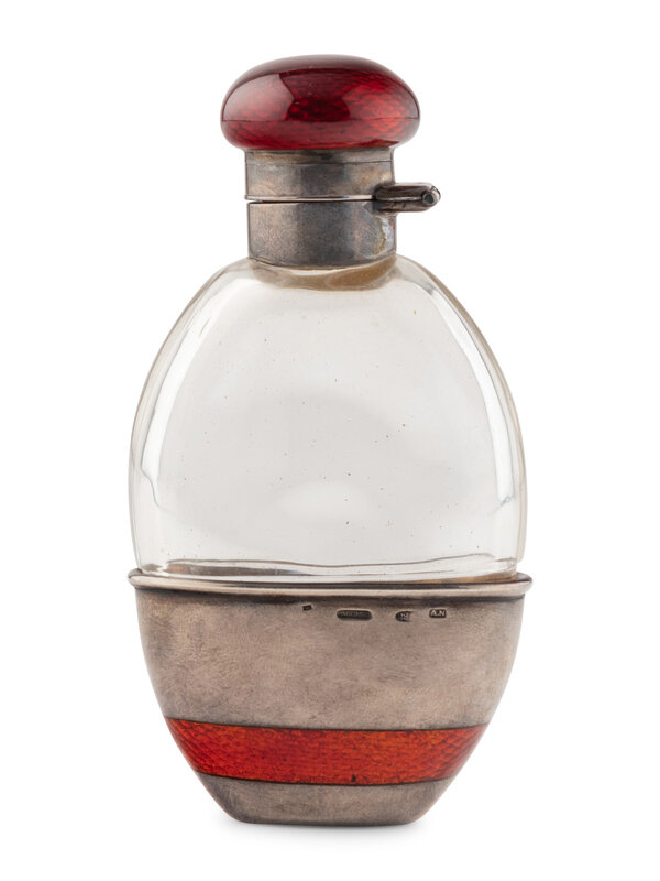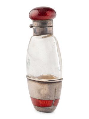 A Russian Silver, Guilloché Enamel and Glass Flask
