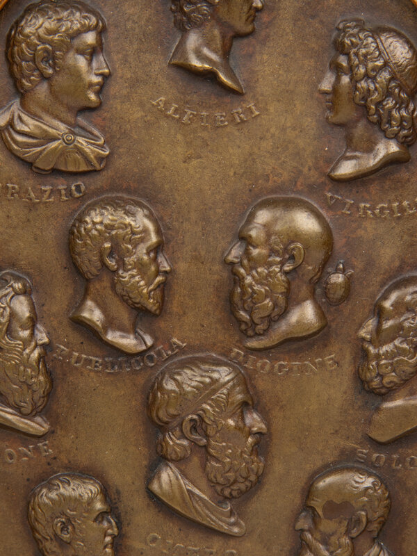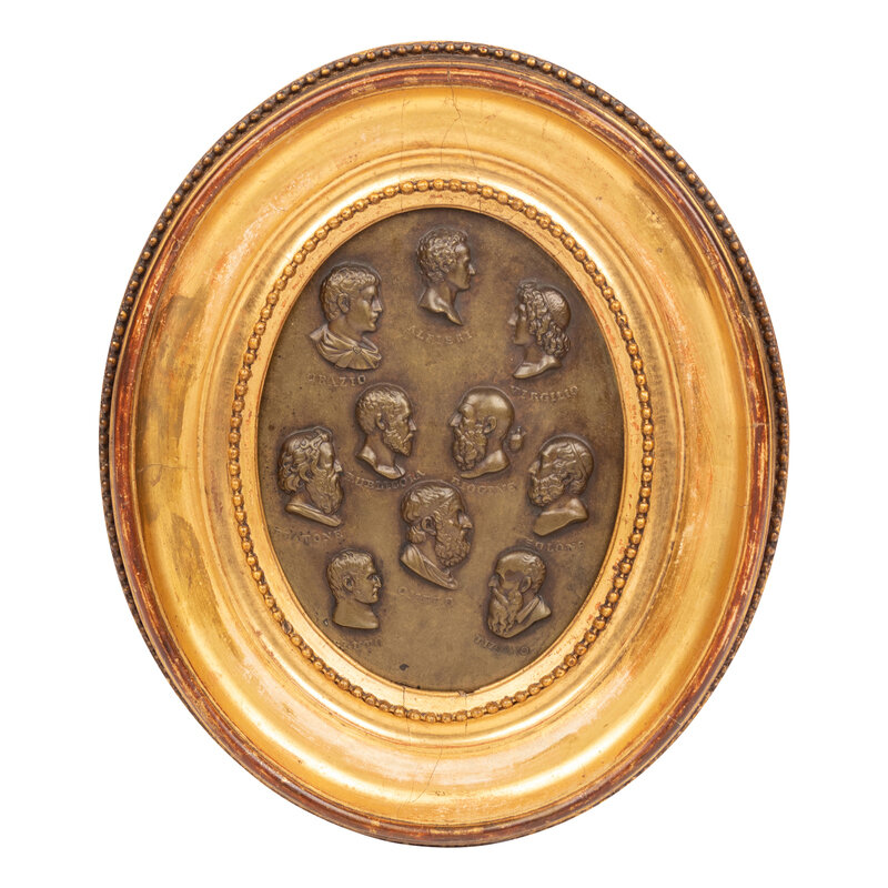 set in a giltwood frame; depicting ten busts of artists, authors, and philosophers.