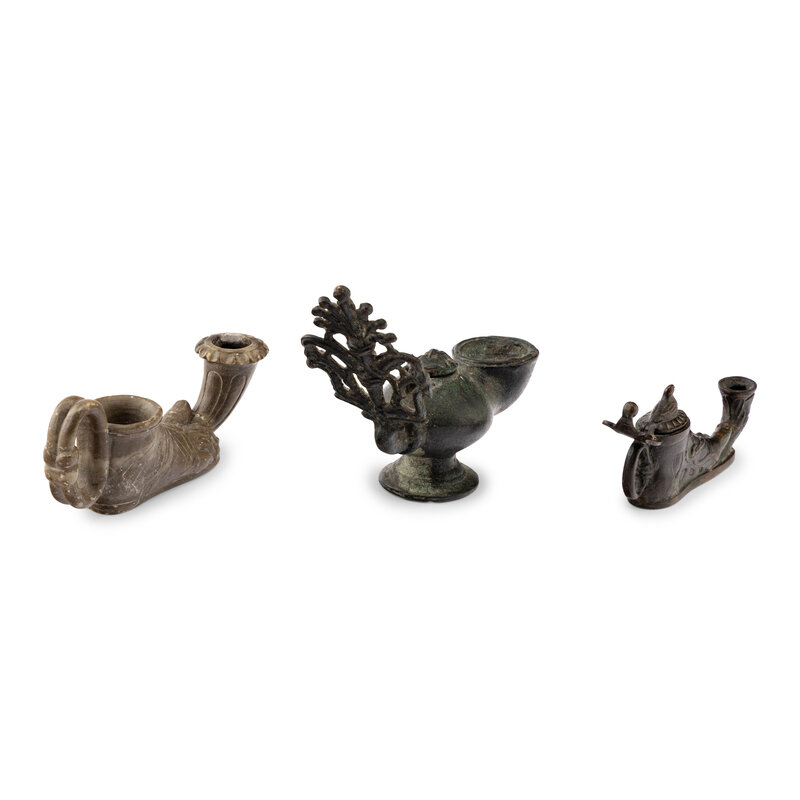 two in cast metal, one in carved soapstone.
