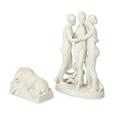 comprising a Royal Copenhagen model of the Lion of Lucerne, with blue wave mark and impressed Eneret mark, and a large Bing and Grondahl figural group of the Three Graces, the Eros's lyre broken off but present.