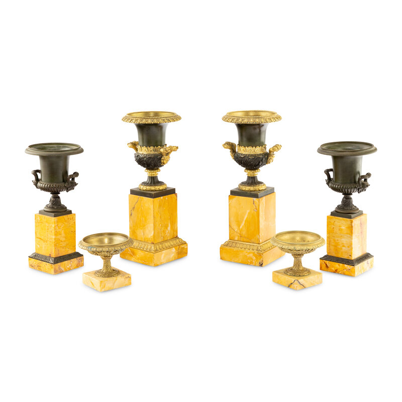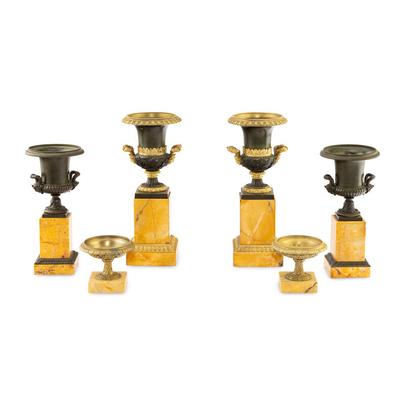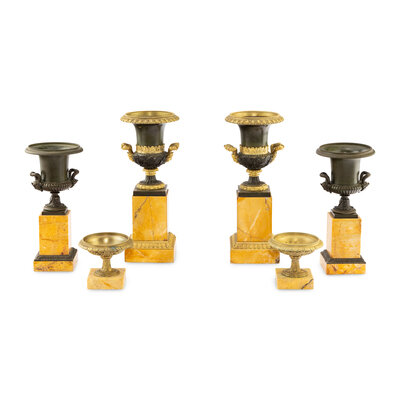 Three Pairs of Gilt and Patinated Bronze and Marble Urns
