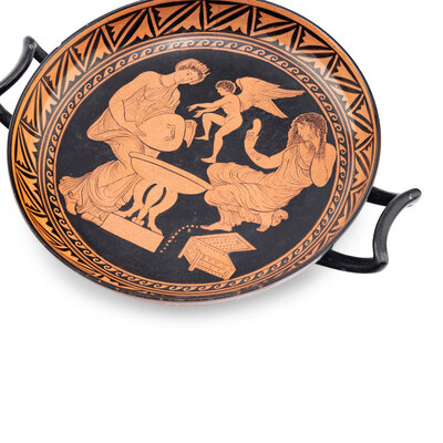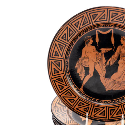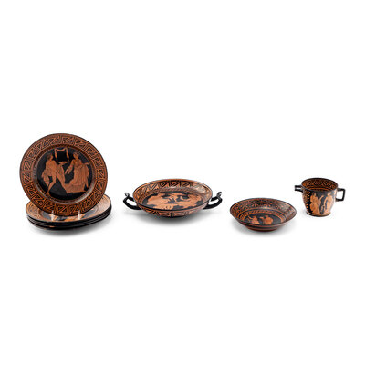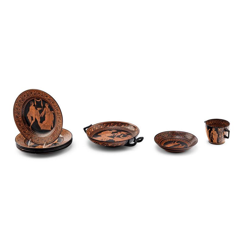 comprising five red-figured plates, a kylix, a small skyphos and an associated saucer, with impressed G marks.